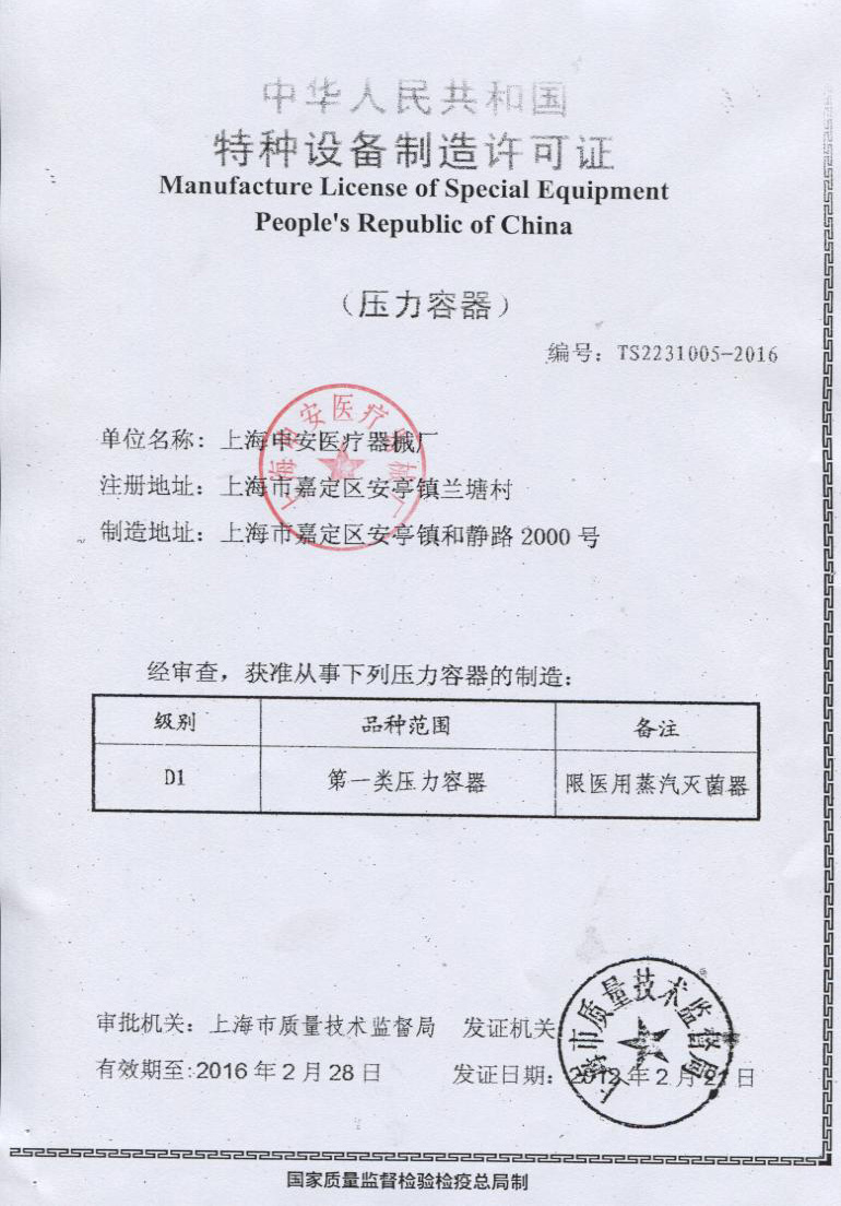 本品符合國家對壓力容器設計與制作的相關規定,并取得了食藥監產品注冊證和消毒產品衛生許可證,是我廠研制開發的新一代手提式滅菌器,其結構先進可靠,具有快捷簡便的操作方式和功能齊全的控制系統,在安全控制上;設置了鍋內有壓力自動鎖蓋及誤操作合蓋不升壓的裝置。本產品采用優質不銹鋼材料精制而成,滅菌指標達到國家醫用手術級標準,是各醫療衛生、大專院校、食品化工、生物科研等單位對器械、敷料、藥液、食品器皿、培養基等物品進行消毒滅菌的理想產品。